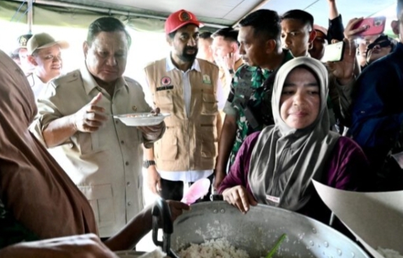 Dari tenda pengungsian, Presiden melanjutkan peninjauan ke dapur umum untuk memastikan kesiapan distribusi makanan. Ia berdialog dengan relawan dan memeriksa stok logistik, bahkan mencicipi hidangan nasi dan ikan tongkol yang disiapkan untuk makan siang para pengungsi.