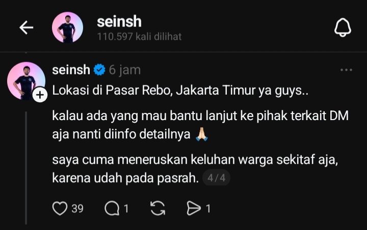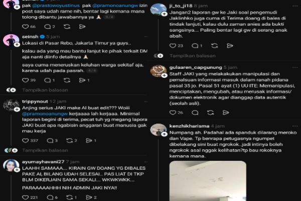 Dalam unggahan itu, pemilik akun mempertanyakan tindak lanjut laporan warga yang telah disampaikan melalui aplikasi JAKI. Ia mengaku kecewa karena penanganan yang ditampilkan dalam sistem diduga tidak sesuai dengan kondisi nyata di lapangan.